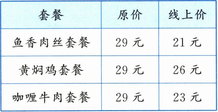 | 鱼香肉丝套餐 | 29 元 | 21 元 |