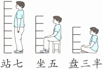 8 我国古代有“站七、坐五、盘三半”之说。就是以人的头长为1个单位,“站七”表示站立时人的身高一般是7个单位(如下图)。爸爸的头长是25厘米,小乐的头长是18厘米。爸爸坐着,小乐站着,照这样计算,此时两人谁更高?