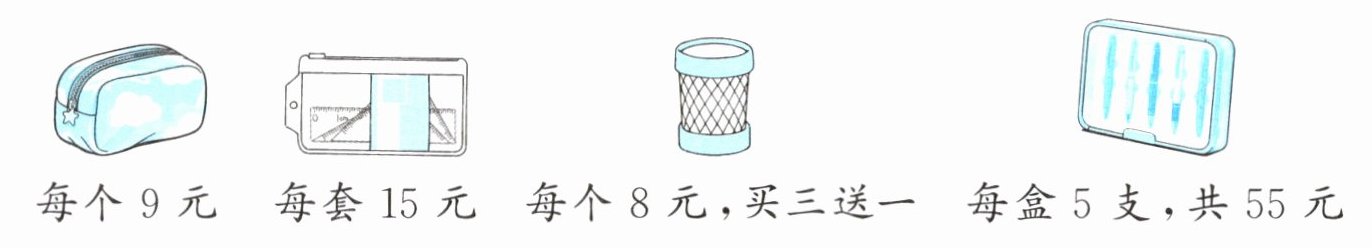 55÷5-9 买到4个笔筒,平均每个多少元?