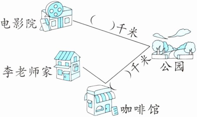 3. 李老师从家跑步到咖啡馆,平均每分钟跑 250 米,跑了 8 分钟。先根据下图估一估,从咖啡馆到公园、从公园到电影院的路程大约各是多少千米?再填一填,最后算一算他家到电影院的路程大约一共是多少千米。