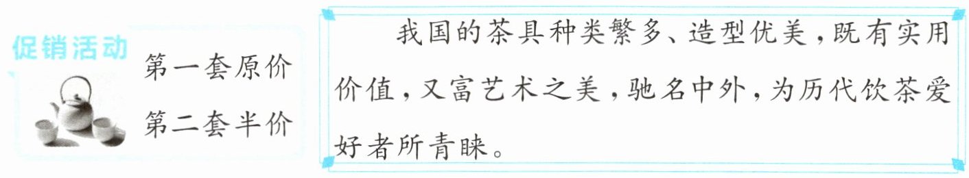 8 张阿姨想买2套茶具,正好商店开展促销活动,她用450元买了2套,那么一套茶具的原价是多少元?(可以先试着画一画,再解答)