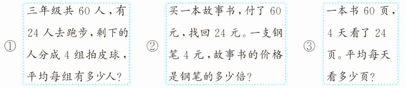 3. 下面三个问题中,能用$(60 - 24) ÷ 4$解决的(
