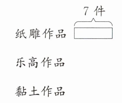 4 三年级举办创意作品展,其中纸雕作品有7件,乐高作品的数量是纸雕作品的2倍,黏土作品的数量是乐高作品的2倍。乐高作品、黏土作品分别有多少件?(先画出表示乐高作品和黏土作品件数的直条,再解答)