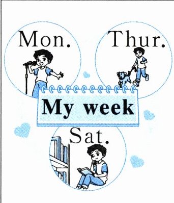 示例:This is my week. On Monday,I have a singing lesson. On Thursday,I walk my dog in the evening. On Saturday,I go to the library to read books. I like Saturday best because reading is fun. I love my week!