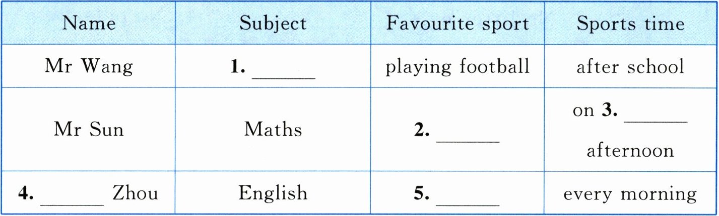 | 4. ______ Zhou | English | 5. ______ | every morning |