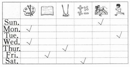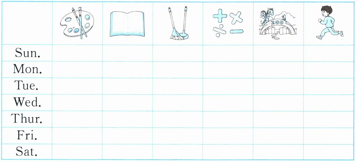 Mon.:walk my dog Tue.:wash the dishes Wed.:wash the dishes Thur.:have a dancing lesson Fri.:go to the library Sat.:visit my grandparents