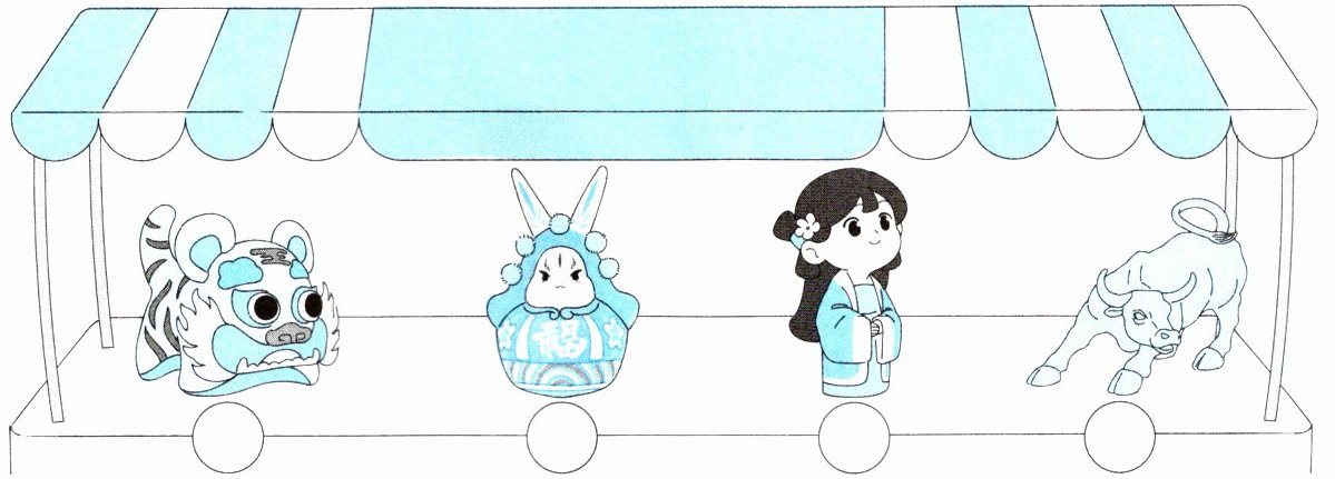 一、同学们来到了民俗街,看到了展台上的各种玩具。听录音,用数字给同学们提到的玩具排序。🎧