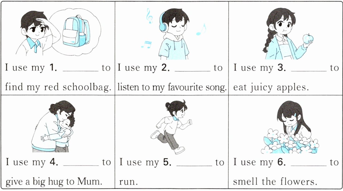 任务一:1.eyes 2.ears 3.mouth 4.arms 5.legs 6.nose 任务二:1.B 2.C 3.B