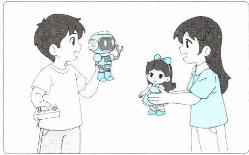 A. They buy new toys. B. The robot is cool.C. They share the toys and play together.