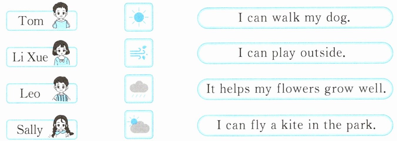 一、Li Xue正在和同学们讨论各自喜欢的天气及理由。听录音,将人物和对应的内容连线。🎧