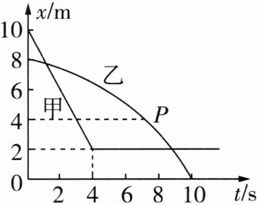 交点代表相遇,因此在0 - 10 s内,甲、乙相遇2次,故C错误。x - t图线的切线斜率的正负表示运动方向,在0 - 4 s内,甲、乙的x - t图线的切线斜率均为负,因此两车的运动方向相同,故D错误。x - t图线的切线斜率的大小表示运动的快慢,乙刚开始比甲运动得慢,后来比甲运动得快,故B正确。0 - 4 s内甲车的x - t图线的斜率不变,因此做匀速直线运动,此后甲车静止,故A错误。