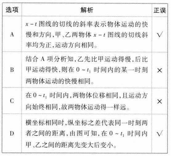 A 0 - t₀时间内,甲、乙的x - t图线的切线斜率正负不同,因此运动方向相反,故C错误。