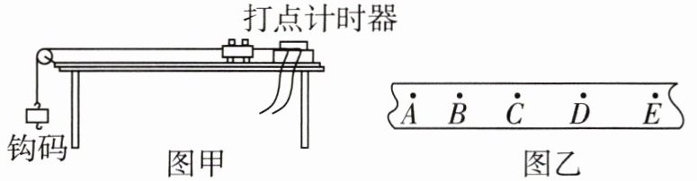 5. 在“用打点计时器测速度”的实验中,如图甲所示,打点计时器接在50Hz的电源上,小车拖着一条纸带做减速运动。打点结束后,在纸带上取A、B、C、D、E五个计数点,相邻两计数点间还有四个点未画出,如图乙所示。已知$x_{AB}= 2.10cm$,$x_{BC}= 2.50cm$,$x_{CD}= 2.90cm$,$x_{DE}= 3.30cm$。