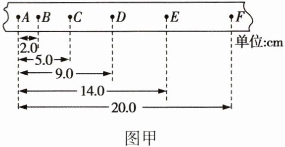 7.在“测量纸带的平均速度和瞬时速度”的实验中,打点计时器使用的交流电源的频率为50Hz,实验中获得的一条纸带如图甲所示,在纸带上选择A、B、C、D、E、F六个计数点,相邻两计数点之间还有四个点未画出。