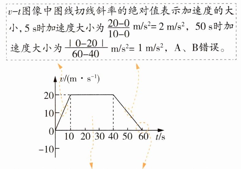 解:A. $ t=5s $时,汽车在0~10s内做匀加速直线运动,加速度 $ a=\frac{\Delta v}{\Delta t}=\frac{20-0}{10-0}m/s^{2}=2m/s^{2} $,A错误。