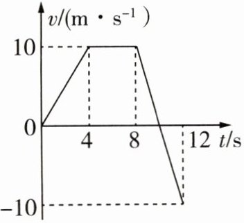 (3) 根据 $v - t$ 图像与时间轴所围面积表示位移可知,质点在 $8\sim10s$ 和 $10\sim12s$ 内的位移大小相等,方向相反,则质点在 $0\sim12s$ 内的位移和 $0\sim8s$ 内的位移相同,即 $x=\frac{4 + 8}{2}×10m=60m$
