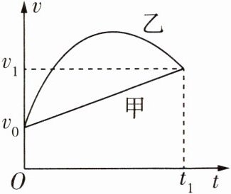 甲物体做匀加速直线运动,全程的平均速度与中间时刻的瞬时速度相等,可知,甲的平均速度$\overline{v}_{甲}=\frac{v_{0}+v_{1}}{2}$;$v - t$图像中,图线与时间轴围成的几何图形的面积表示物体通过的位移,根据题图可知,$0\sim t_{1}$时间内乙的位移大于甲的位移,又$\overline{v}=\frac{x}{t}$,则有$\overline{v}_{甲}<\overline{v}_{乙}$。