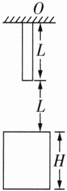 5.一根长为$L$的棒,上端悬挂在天花板上的$O$点,在棒的正下方,距棒的下端也为$L处固定着一个高为H$的圆筒,如图所示,棒被释放后做自由落体运动。求:(重力加速度为$g$)
