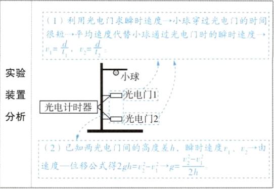 实验装置分析:利用光电门求瞬时速度→小球穿过光电门的时间很短→平均速度代替小球通过光电门时的瞬时速度→$v_{1}=\frac{d}{t_{1}}$,$v_{2}=\frac{d}{t_{2}}$。已知两光电门间的高度差 $h$,瞬时速度 $v_{1}$、$v_{2}$→由速度—位移公式得 $2gh = v_{2}^{2}-v_{1}^{2}$→$g=\frac{v_{2}^{2}-v_{1}^{2}}{2h}$。