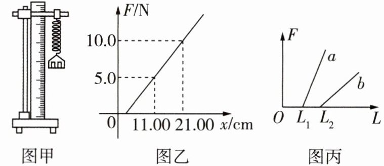 (3)另一位同学使用两条不同的轻质弹簧$a和b$,得到的弹力与弹簧长度的关系图像如图丙所示,下列表述正确的是______。