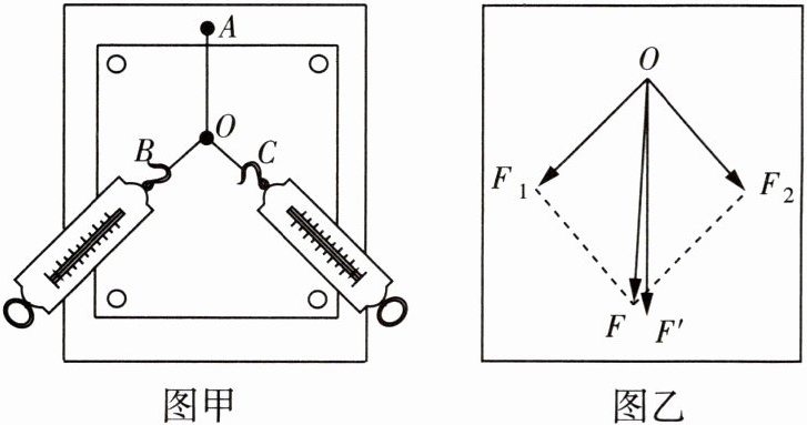 (3)$F_{1}$和$F_{2}$合力的理论值是通过平行四边形定则得到的值,而实际值是单独一个力将结点拉到O点时的值,因此F是$F_{1}$和$F_{2}$合力的理论值,$F'$是$F_{1}$和$F_{2}$合力的实际测量值。