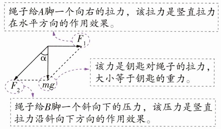 解:钥匙对轻绳的拉力大小等于钥匙的重力 $mg$,将该力按作用效果分解为水平向右拉A脚的分力$F_{1}$和斜向压B脚的分力$F_{2}$。