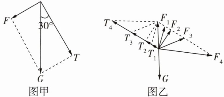 解法2 物体受重力$G$、拉力$F$、线的拉力$T$三个力的作用,将线的拉力和力$F$合成,其合力应与重力等大、反向,物体重力不变,则力$F$和线的拉力的合力竖直向上,大小不变,通过作图可知(图乙),当拉力$F$与线垂直时,拉力最小,即$F_{\min}=G\sin30^{\circ}=5N$。