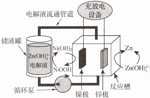 C 解析:由总反应可知,放电时锌极上锌失去电子发生氧化反应为负极,镍极的NiOOH得到电子发生还原反应为正极。A.充电时,锌极为阴极,电极反应为 $ \text{Zn}(\text{OH})_{4}^{2-}+2e^{-}=\text{Zn}+4\text{OH}^{-} $,A正确;B.放电时,镍极为正极,电极反应为 $ \text{NiOOH}+\text{H}_{2}\text{O}+\text{e}^{-}=\text{Ni}(\text{OH})_{2}+\text{OH}^{-} $,B正确;C.充电时,镍极为阳极,阴离子从锌极区向镍极区移动, $ \text{Zn}(\text{OH})_{4}^{2-} $在锌极上得电子生成金属锌,C错误;D.利用循环泵驱动电解液使其通过输送管道在电池反应槽与储液罐之间循环流动,可有效抑制电池内部电解液的浓度差造成的影响,从而提高电池能量效率,D正确。