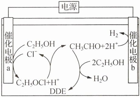 D 解析:A.b极氢离子生成氢气发生还原反应,为阴极,则催化电极的电极电势: $ \text{b}\lt\text{a} $,A错误;B.阴极反应得到电子的还原反应,反应为 $ 2\text{H}^{+}+2e^{-}=\text{H}_{2}\uparrow $,B错误;C.由图可知,反应中生成2个氢离子,又消耗2个氢离子,故pH值不变,C错误;D.由图可知,每产生 $ 1 \text{mol H}_{2} $的周期中,有1mol乙醇生成乙醛、乙醛又与2mol乙醇生成水和DDE,故需要消耗 $ 3 \text{mol C}_{2}\text{H}_{5}\text{OH} $,D正确。