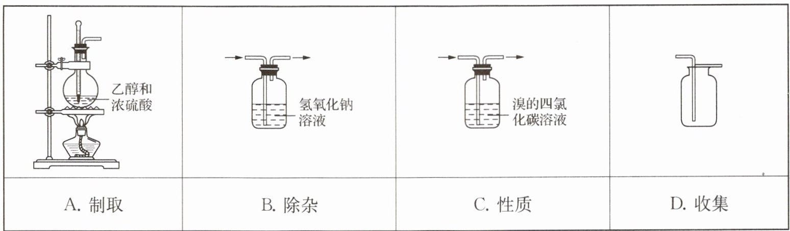 D 解析: A. 由实验装置图可知, 装置 $\mathrm{A}$ 中发生的反应为在浓硫酸作用下乙醇在 $170^{\circ} \mathrm{C}$ 条件下发生消去反应生成乙烯和水, 则装置 $\mathrm{A}$ 为乙烯的制取装置, 故 $\mathrm{A}$ 正确; B. 由实验装置图可知, 装置 $\mathrm{B}$ 中盛有的氢氧化钠溶液用于除去乙烯气体中混有的二氧化硫和二氧化碳杂质, 则装置 $\mathrm{B}$ 为乙烯的除杂装置, 故 $\mathrm{B}$ 正确; C. 由实验装置图可知, 装置 $\mathrm{C}$ 中盛有的溴的四氯化碳溶液发生加成反应使溶液褪色, 则装置 $\mathrm{C}$ 为验证乙烯性质的装置, 故 $\mathrm{C}$ 正确; D. 乙烯的密度与空气的密度接近, 不能用排空气法收集乙烯气体, 则装置 $\mathrm{C}$ 不能用于收集乙烯气体, 故 D 错误。