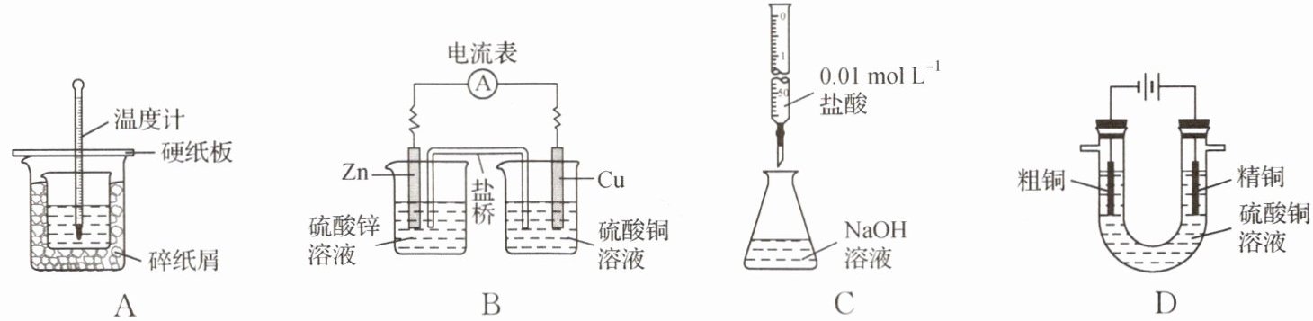 B 解析: A. 装置图 $\mathrm{A}$ 缺少环形玻璃搅拌器, 且小烧杯与大烧杯的上沿相平, A 说法错误; B. 装置图 $\mathrm{B}$ 锌作负极失电子生成锌离子, 铜作正极, 铜离子得电子生成铜, 可用于验证原电池反应原理, B 说法正确; C. 装置图 $\mathrm{C}$ 盐酸应使用酸式滴定管, 使用装置错误, C 说法错误; D. 装置图 D 为电解装置, 粗铜作阳极, 精铜作阴极, D 说法错误。