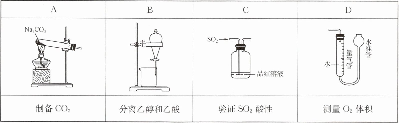 D 解析: A. $\mathrm{Na}_{2} \mathrm{CO}_{3}$ 固体比较稳定, 受热不易分解, 所以不能采用加热碳酸钠的方式制备二氧化碳, A 错误; B. 乙醇和乙酸是互溶的, 不能采用分液的方式分离, 应采用蒸馏来分离, B 错误; C. 二氧化硫通入品红溶液中, 可以验证其漂白性, 不能验证酸性, C 错误; D. 测量氧气体积时, 装置选择量气筒, 测量时要恢复到室温, 两边液面高度相等, D 正确。
