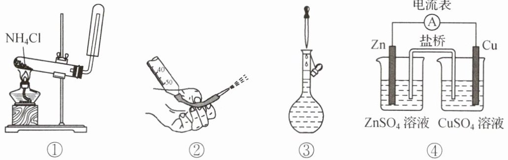 C 解析: A. 氯化铵受热分解生成氨气和氯化氢, 遇冷又化合生成氯化铵, 则直接加热氯化铵无法制得氨气, 实验室用加热氯化铵和氢氧化钙固体的方法制备氨气, 故 A 错误; B. 高锰酸钾溶液具有强氧化性, 会腐蚀橡胶管, 所以高锰酸钾溶液应盛放在酸式滴定管中, 不能盛放在碱式滴定管中, 故 B 错误; C. 配制一定物质的量浓度的溶液时, 俯视刻度线定容会使溶液的体积偏小, 导致所配溶液浓度偏大, 故 C 正确; D. 由图可知, 锌铜原电池中, 锌电极为原电池的负极, 铜为正极, 盐桥中阳离子向硫酸铜溶液中迁移, 故 D 错误。