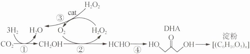 19.A 解析:A.由反应机理可知,反应①发生的反应为二氧化碳与氢气反应生成甲醇和氢气,则消耗4.4g二氧化碳,反应转移电子数为$\frac{4.4g}{44g/mol}×6×N_{A}mol^{-1} = 0.6N_{A}$,故A正确;B.标准状况下,过氧化氢为液态,无法计算11.2L过氧化氢的物质的量和含有的非极性键的数目,故B错误;C.甲醛和DHA的最简式相同,都为$CH_{2}O$,则30g甲醛与DHA的混合物中含氧原子数为$\frac{30g}{30g/mol}×N_{A}mol^{-1} = N_{A}$,故C 错误;D.由淀粉酿酒涉及的反应可得如下关系式:$(C_{6}H_{10}O_{5})_{n} \sim nC_{6}H_{12}O_{6} \sim 2nC_{2}H_{5}O_{2}$,则16.2g淀粉在酶的作用下发酵酿酒最多可生成乙醇分子数为$\frac{16.2g}{162n g/mol}×2n×N_{A}mol^{-1} = 0.2N_{A}$,故D错误。