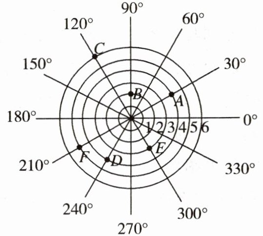 6. 如图,雷达探测器测得 $ A $,$ B $,$ C $,$ D $,$ E $,$ F $ 6 个目标. 按照规定的目标表示方法,目标 $ E $,$ F $ 的位置表示为 $ E(3,300^{\circ}) $,$ F(5,210^{\circ}) $. 按此方法,在表示目标 $ A $,$ B $,$ C $,$ D $ 的位置时,下列不正确的是 (