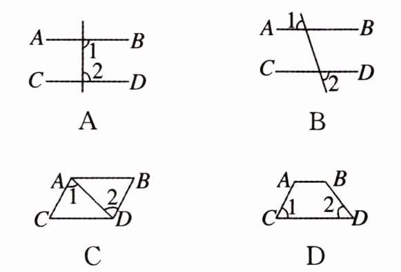 2. 下列各图中,可以由$AB// CD得到∠1= ∠2$的是(