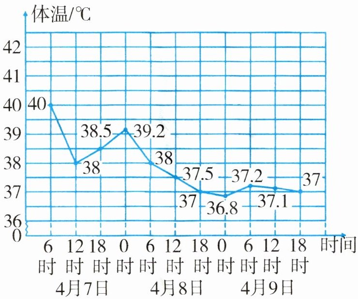 二、下面是一位病人4月7日6时~4月9日18时的体温记录折线统计图。