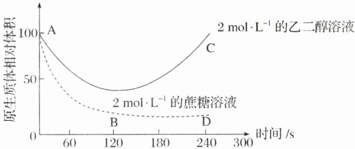 2. B $A→B$段,原生质体相对体积逐渐减小,说明细胞在不断失水,因此细胞的细胞液浓度逐渐增大,A正确;在乙二醇溶液中,120s之前,因乙二醇溶液的浓度大于细胞液的浓度,细胞不断失水,导致细胞发生质壁分离;伴随着细胞失水,部分乙二醇被细胞吸收,导致细胞液的浓度不断增大,使得120s之后,乙二醇溶液的浓度小于细胞液的浓度,细胞吸水,发生质壁分离复原,而不是120s后乙二醇开始逐渐进入细胞,B错误,C正确;原生质层是由细胞膜和液泡膜以及两层膜之间的细胞质构成的,具有选择透过性,该实验现象表明原生质层相当于一层半透膜,D正确。故选B。