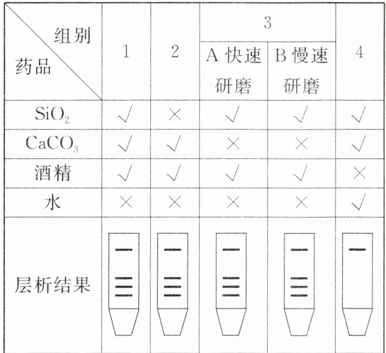 C 滤纸条由上至下四条色素带依次是胡萝卜素、叶黄素、叶绿素 a、叶绿素 b,滤纸条最上方的条带是胡萝卜素,橙黄色,A 正确;组别 2 相比较组别 1 未添加二氧化硅,研磨不充分,色素含量少,颜色可能浅,B 正确;通过实验的单一变量分析,3 - A 和 3 - B 的变量是研磨速度,不能说明碳酸钙对叶绿素有保护作用,C 错误;组别 4 未加入酒精,脂溶性光合色素无法提取,加入了水,可以提取到水溶性色素,D 正确。故选 C。