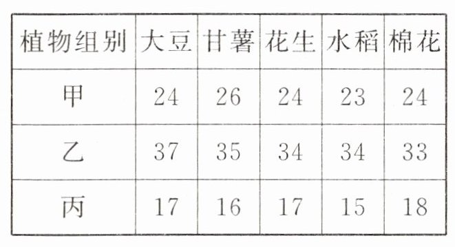 7. (2025·高一上山西期末)研究人员以大豆、甘薯、花生、水稻、棉花作为实验材料,分别进行三种不同实验处理:甲组提供大气$CO_2$浓度;乙组提供$CO_2$浓度加倍环境;丙组先在$CO_2$浓度加倍的环境培养60天,测定前一周恢复为大气$CO_2$浓度。整个生长过程保证充足的水分供应,其他条件相同且适宜,选择晴天上午测定各组的净光合作用速率,结果如下表(单位:$μmol·m⁻^2·s⁻^1)。$下列叙述错误的是 (
