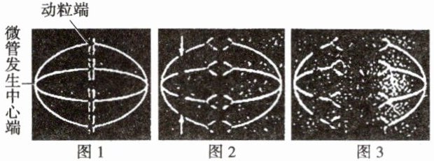 11. (多选)细胞分裂过程中染色体移向两极的机制有三种假说:假说 1 认为由微管发生中心端微管解聚引起,假说 2 认为由动粒端微管解聚引起,假说 3 认为由微管发生中心端和动粒端微管同时解聚引起。用不同荧光标记纺锤丝和染色体如图 1,用激光使纺锤丝上箭头处的荧光淬灭(不影响其功能)如图 2,一段时间后结果如图 3,相关叙述正确的是(