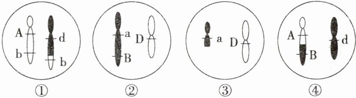 D A. 据图分析,①配子中右侧的染色体d部分来自非同源染色体,属于染色体结构变异中的易位,A错误;B. ③配子中a基因出现的原因是发生了交叉互换,B错误;C. ④配子出现的原因是同源染色体的非姐妹染色单体的交叉互换,C错误;D. 从图中基因及染色体的关系来看,Ab基因在同一条染色体上,aB基因在另一条与之同源的染色体上,而D、d基因位于另一对同源染色体上,①②③④可能来自同一个精原细胞,D正确。故选D。