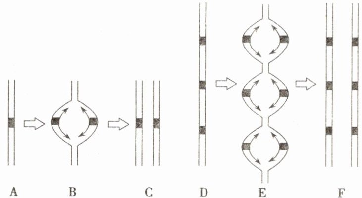 2. 下列为 DNA 复制的局部图,$ A \rightarrow B \rightarrow C $表示大肠杆菌的 DNA 复制,$ D \rightarrow E \rightarrow F $表示哺乳动物的 DNA 分子复制。其中 A 中含有 48502 个碱基对,子链延伸速率是 $ 10^{5} $个碱基对/min。下列相关叙述不正确的是(