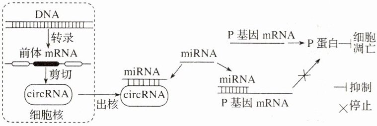 2. B miRNA 也是由 DNA 转录后加工而来,A 错误;减少细胞内 circRNA 的含量,可减少 miRNA 与之结合,使 miRNA 更多的与 P 基因的 mRNA 结合,从而降低 mRNA 的翻译水平,则表达出的 P 蛋白减少,P 蛋白具有抑制细胞凋亡的作用,凋亡的细胞会增加,B 正确;circRNA 与 miRNA 的碱基互补配对形式有 A-U、U-A、C-G、G-C,基因的转录过程的碱基互补配对形式有 A-U、T-A、C-G、G-C,C 错误;circRNA 与 miRNA 可以碱基配对形成复合物,D 错误。故选 B。
