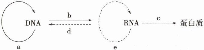 5. D A. 据图分析,b 表示转录,大肠杆菌是原核生物,没有核膜,其细胞中的转录过程可以发生在拟核区和细胞质中,A 正确;B. HIV 的遗传物质是 RNA,其遗传信息的流向包括 d 逆转录、aDNA 复制、b 转录、c 翻译,B 正确;C. b 表示转录、e 表示 RNA 的复制,两个过程的产物都是 RNA,因此需要的原料都是核糖核苷酸,C 正确;D. c 表示翻译,该过程中 tRNA 上的反密码子与 mRNA 上的密码子之间遵循碱基互补配对原则,D 错误。故选 D。