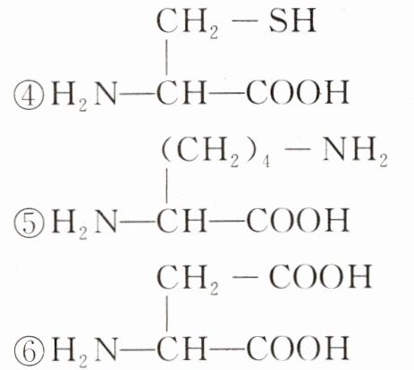6. D 每个氨基酸都含有一个中心碳原子,其四个化学键分别连接氨基、羧基、氢和 R 基,②③不属于氨基酸,因此不能用于人体蛋白质的合成,A 正确;氨基酸①的 R 基是氢,是人体内相对分子质量最小的氨基酸,B 正确;组成该 49 肽的其它氨基酸都只有一个羧基,⑥有两个羧基,根据氧原子守恒计算,假定氨基酸⑥有 A 个,氧原子的个数 = 4A + 2(49 - A) - 48 = w,求得 A = (w - 50)/2 个,C 正确;氨基酸⑤的 R 基中含有氨基,因此该多肽的 N 不仅分布在 - CO - NH - 及末端的 - NH₂ 上,还分布在 R 基中,D 错误。故选 D。