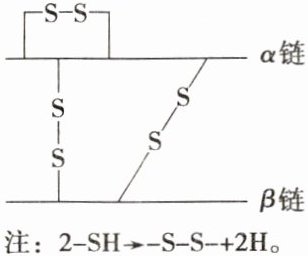 5. 1965年,我国科学家在世界上率先合成了具有与天然胰岛素一样生物活性的结晶牛胰岛素(结构如图所示)。其大致过程是先用化学方法分别合成胰岛素的α、β2条肽链(α链有21个氨基酸,β链有30个氨基酸),再催化形成二硫键。下列叙述错误的是 (