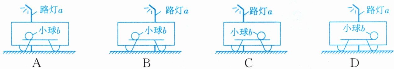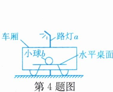 4. 如图,列车停在平直轨道上,车厢中小球b静止,忽略桌面对b的摩擦及空气的影响。列车启动后,下列选项中的情况可能出现的是(