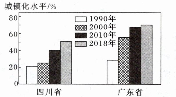 根据“四川省和广东省四个年份城镇化水平统计图”以及“四川省和广东省2018年、2020年城镇化统计表”。读图,完成1~2题。
