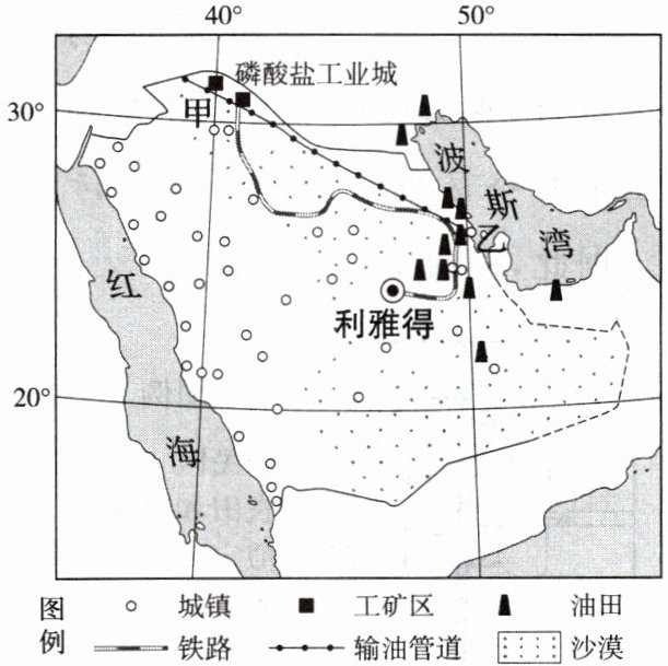 沙特阿拉伯人口主要集中在沿海和内陆绿洲地区。21世纪初,该国甲地发现便于开采、储量丰富的优质磷酸盐矿(位置见下图)。初期开采的矿石运入乙地加工。2013年,该国在甲地附近筹建磷酸盐工业城,使其成为集开采、加工于一体的国际磷酸盐工业中心。
